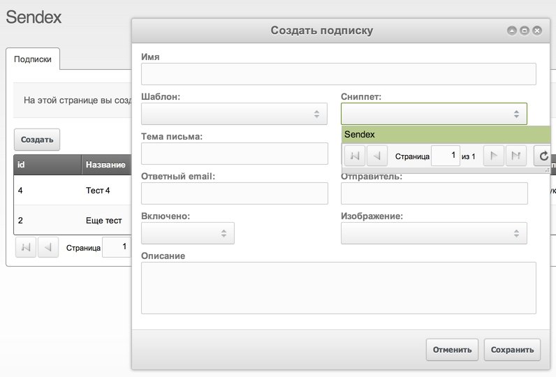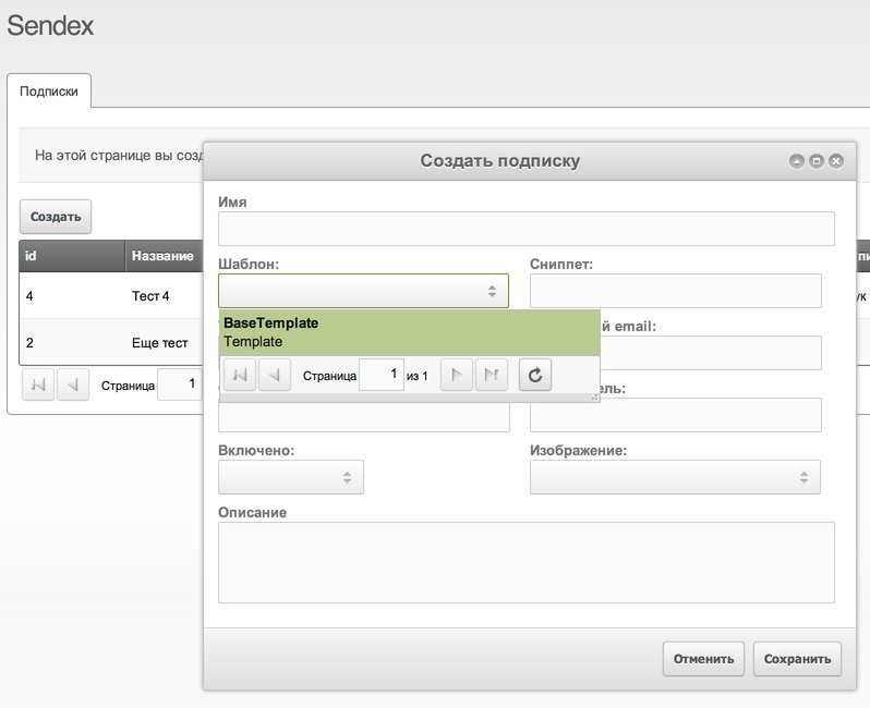 Ext.extend(Sendex.grid.Newsletters,MODx.grid.Grid, {/* Здесь можно добавить или переписать методы расширяемого объекта*/});Это просто пример для понимания приципа. При реальной работе нужно еще задать разных параметров таблице.
