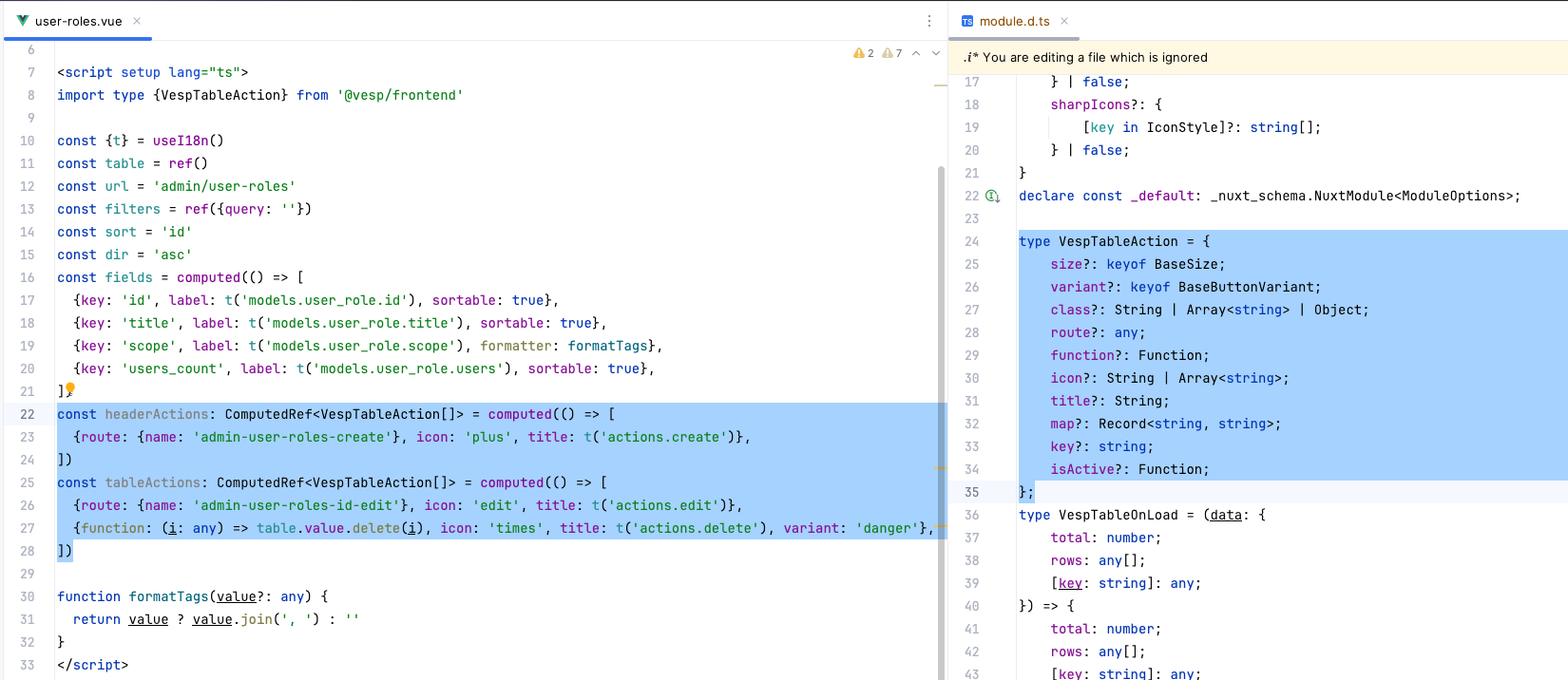Как и раньше, @vesp/frontend является модулем для Nuxt, нужно просто подключить его и указать настройки. Работает поддержка типов, всё экспортируется, подсказки в IDE вам помогут: