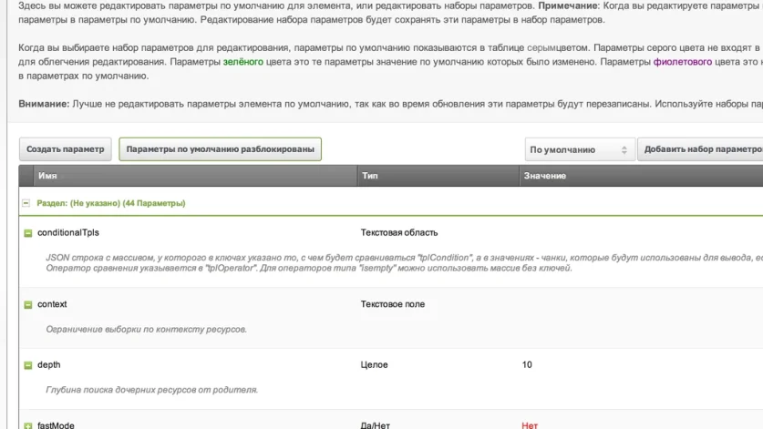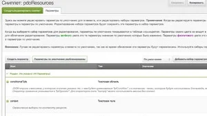 У всех элементов MODX можно прописывать параметры - они будут видны на соответствующей вкладке при просмотре элемента.