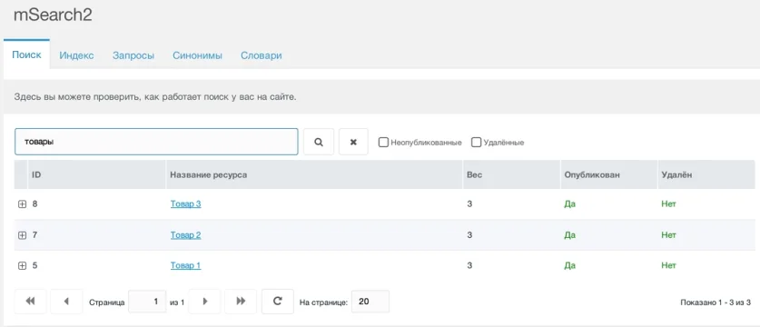 Обратите внимание, что поиск - морфологический. Например, по запросу "товары" mSearch2 находит рсеурсы с названием "Товар", а вот встроенный поиск MODX 2.3 - нет. Он ищет точное совпадение.