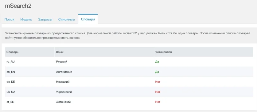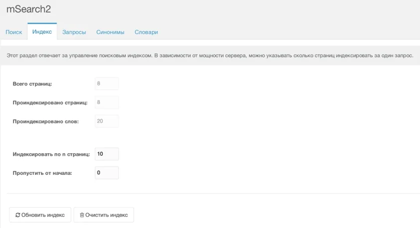 После этого вам нужно проиндексировать весь сайт. Делается это только после первой установки mSearch2, изменении набора языков или настроек индексировани.