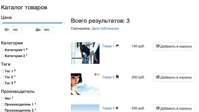 Возможность выводить результаты поиска и фильтрации любыми сниппетами.