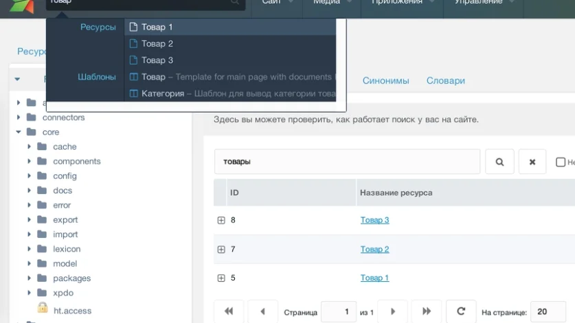 Таким образом, вы получаете морфологический поиск по ресурсам сайта прямо в админке.