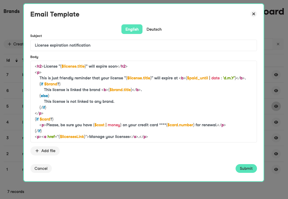 public function sendEmail(string $subject, string $tpl, ?array $data = []): ?string