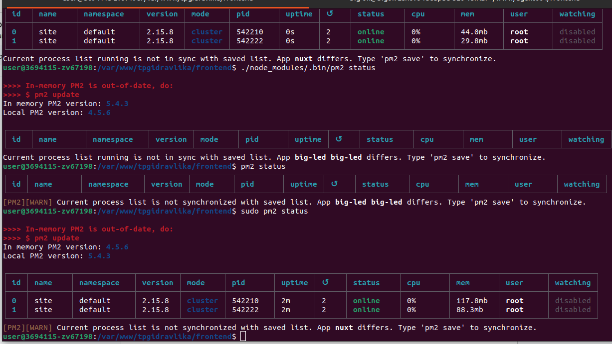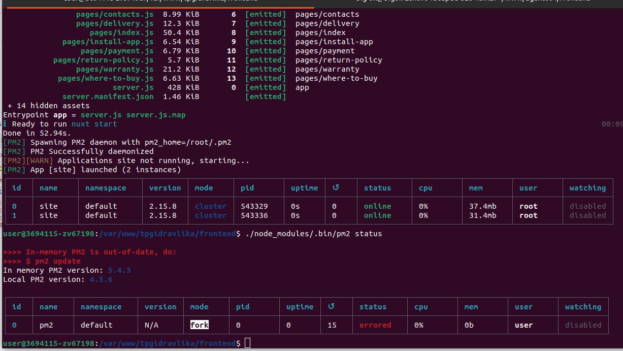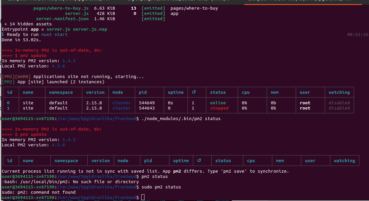 Когда сервер запущен, вы можете вызывать ./frontend/node_modules/.bin/pm2 с разными командами, например проверить состояние приложений ./frontend/node_modules/.bin/pm2 status, logs выведет сообщения, а monit запустит своеобразный центр управления.