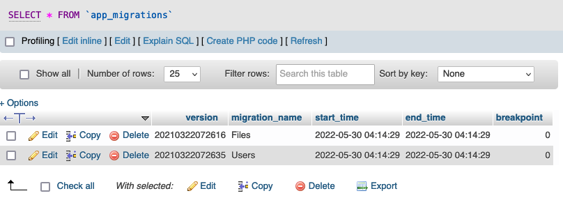 Итак, при запуске composer db:migrate Phinx смотрит на имеющиес миграции и выполняет новые. Как он знает, какие миграции уже были выполнены? Очень просто - он сохраняет их имена в таблице old_migrations.